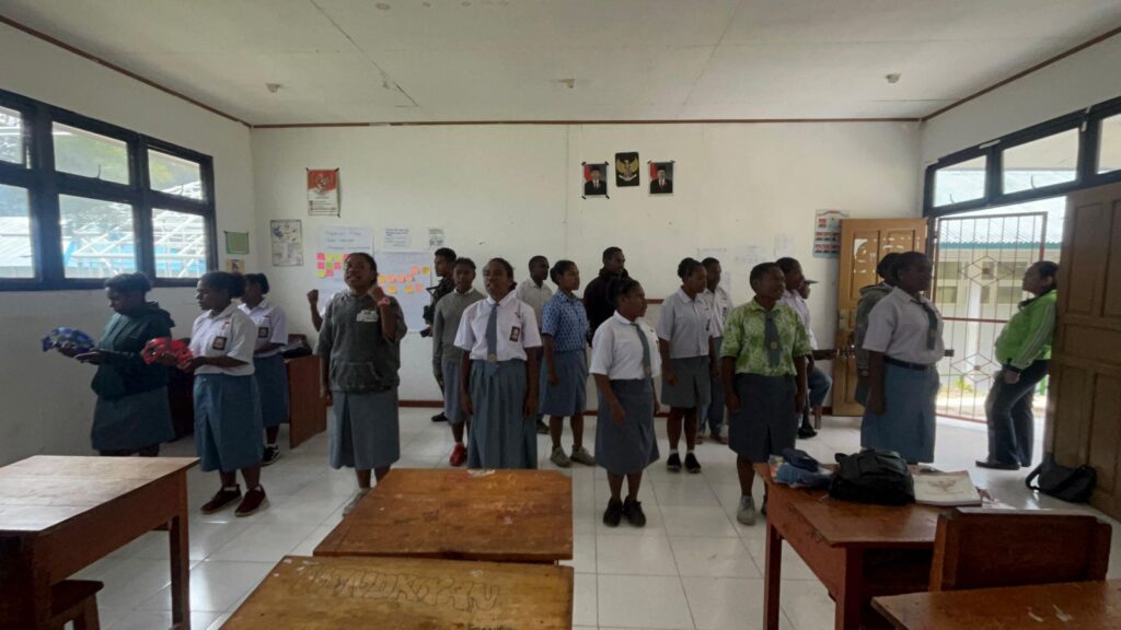 [ ILAGA ] – Personel TK Kosatgas Satgas Mobile Yonif 323/Buaya Putih berikan pelatihan kepada siswa-siswi SMA Negeri 1 Ilaga tentang cara bermain Alat Musik dan Bernyanyi bertempat di SMA Negeri 1 Ilaga, Kampung Wako, Distrik Ilaga, Kabupaten Puncak, Papua Tengah, Jumat (08/11/2024).