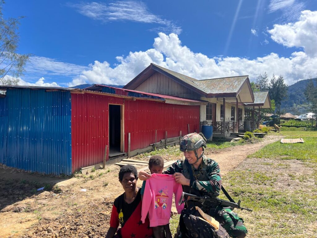 [ GOME ] – TK Gome Satgas Yonif 323 Buaya Putih membagikan kebahagiaan dengan melaksanakan kegiatan berbagi pakaian langsung door to door ke warga di Distrik Gome, Kabupaten Puncak, Papua Tengah, Rabu (16/10/2024).