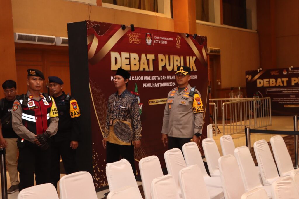 KOTA KEDIRI – Ratusan personel gabungan Polres Kediri Kota Polda Jatim dan TNI disiagakan saat acara debat pamungkas Pilwali Kota Kediri Jawa Timur, untuk mengantisipasi kerawanan dan gesekan antarpendukung.
